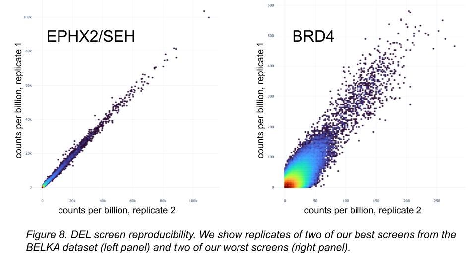 Finally, we could be bad at lab experimentation ourselves (Figure 8). Maybe our dataset is terrible! To help test that idea, we’ll be releasing the raw data from all screen replicates and controls, about 4B physical measurements, very soon (September 2024, on Polaris). We invite the community to examine their quality when we do, and perhaps use them in the future to show generalization with superior methods.