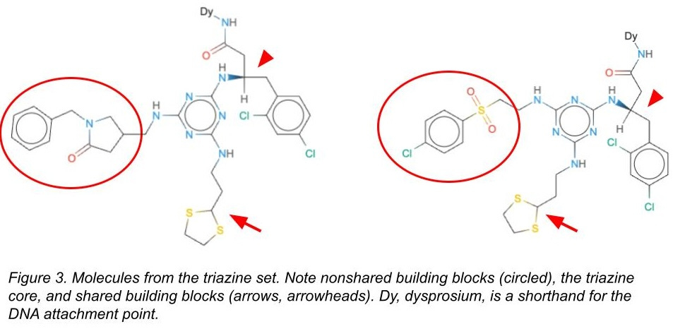 This result is troubling to me as this is exactly what computational chemistry and cheminformatics is supposed to do - translate to previously unseen structures. While there is certainly a benefit and enrichment for the triazine non-shared BBs, the non-triazine set shows no enrichment for hits based on predictions. It is an interesting result and certainly an interesting problem that remains to be solved.