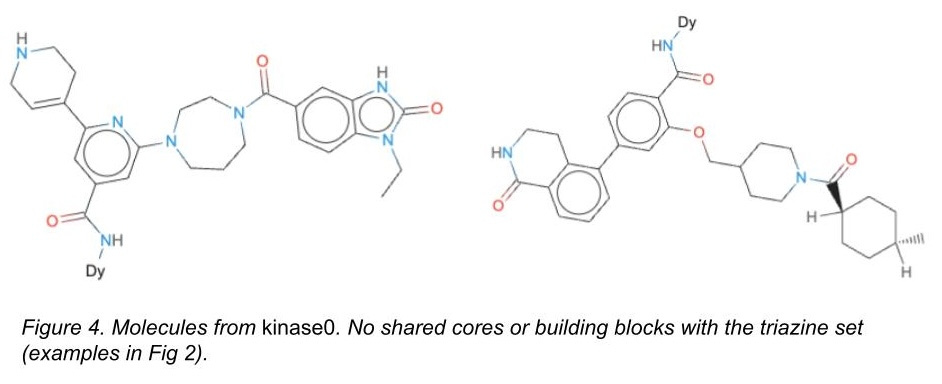 With these splits in hand, we asked competitors to train on the triazine set, and then asked them to predict the likelihood of binders from a) a lot of triazine-core molecules with building blocks shared between test and training sets, b) a lot of triazine-core molecules that did not share building blocks with the training set, and c) a lot of kinase0 molecules, which shared nothing at all. We asked them to demonstrate memorization, to demonstrate generalization within molecules that had the same core, and then to demonstrate generalization into new chemical space entirely.