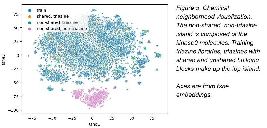 - For the test set only, we also added a completely different chemical library with different cores and different attachment chemistries that we had also screened against these targets (Figure 4). It’s a subset of a chemical library we designed here at Leash we call kinase0. Kinase0 is so different that only models capable of generalizing have a prayer of accurately predicting binders from this library.