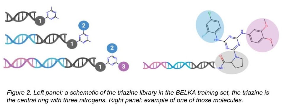 We imagined the following scenario: one could run a DEL screen, train on the data, and then use that model to predict the likelihood of binding from a big orderable catalog - like the Enamine catalog - and run a smaller number of the top-predicted molecules on more expensive functional tests. This is a very common strategy; a different machine learning chemistry contest, the CACHE Challenge, operates this way. Google and X-Chem tried it too.
