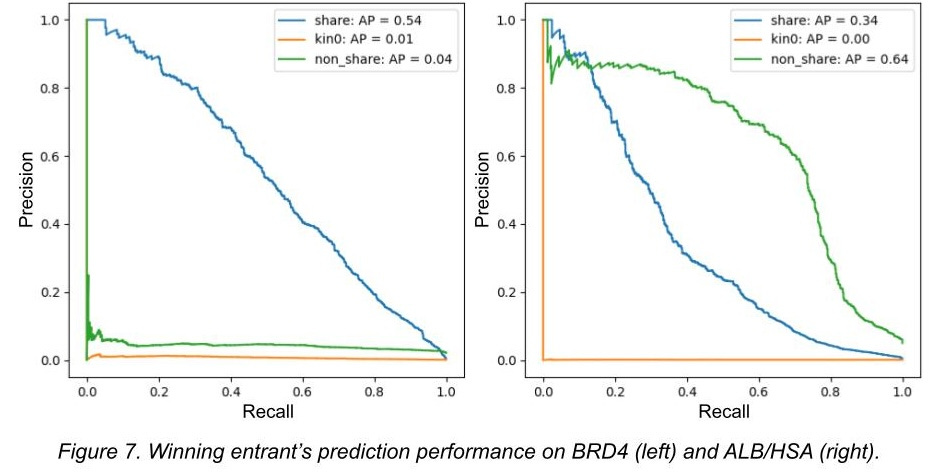 As I mentioned, we split the test set into three groups, and we challenged the competitors to make predictions on potential binders to three different proteins. Here, we use precision-recall curves to demonstrate performance (click here for a precision-recall refresher if you need it).